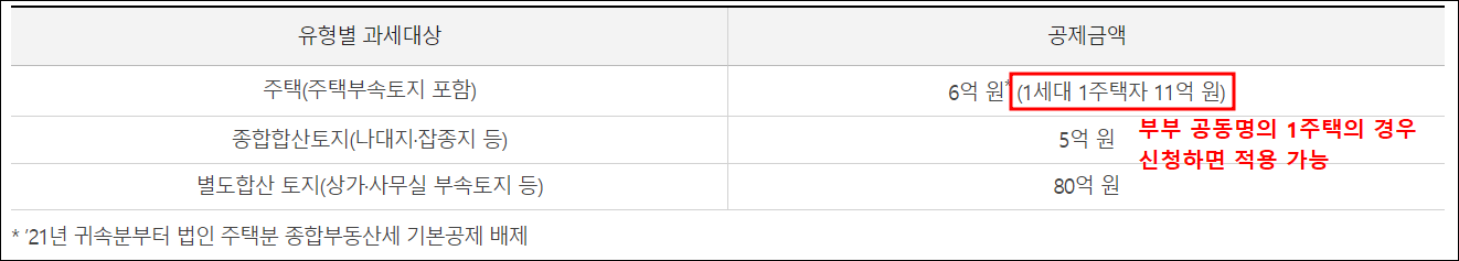 1세대 1주택자의 경우 공제금액이 11억 원으로 2주택자 이상에 대한 공제금액 6억 원보다 훨씬 커서 유리한 측면이 있습니다.