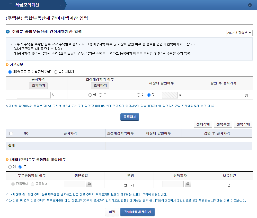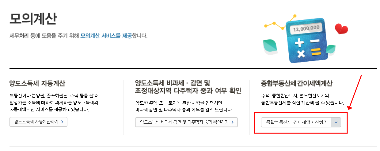 [홈택스 메인화면] - [세금종류별 서비스] - [세금모의계산] - [종합부동산세 간이세액계산]