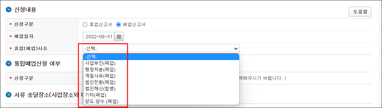 ▼ 정확한 폐업일자를 지정하고, 폐업사유를 선택해주세요.